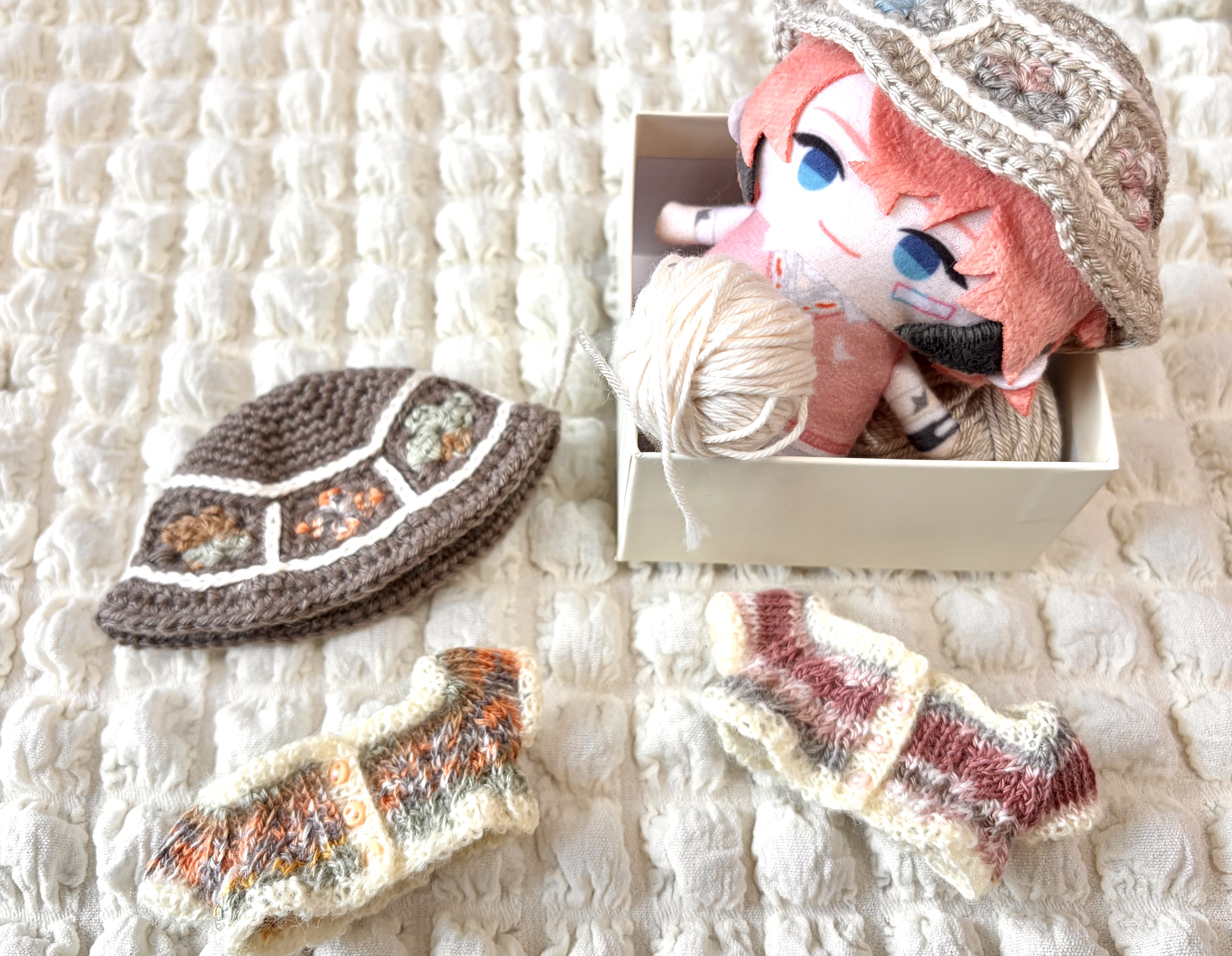 今年は人間サイズのものは帽子のみ編めた これは気に入ってる毛糸屋さんで買った毛糸で編んだ帽子を、その毛糸屋に持って行って見て見て♫してマネキンに被せて撮らせてもらった写真 お店の人や他のお客さんに褒めてもらい、えへへ☺️と照れて満足人間サイズ以外の細々したものばっかり編んでいた にじぱぺサイズの服を編むのが楽しすぎて、ちょっと本気で服屋さんしたい気持ちがある もし可能ならちょっとだけにじそにも持っていきたいですね……