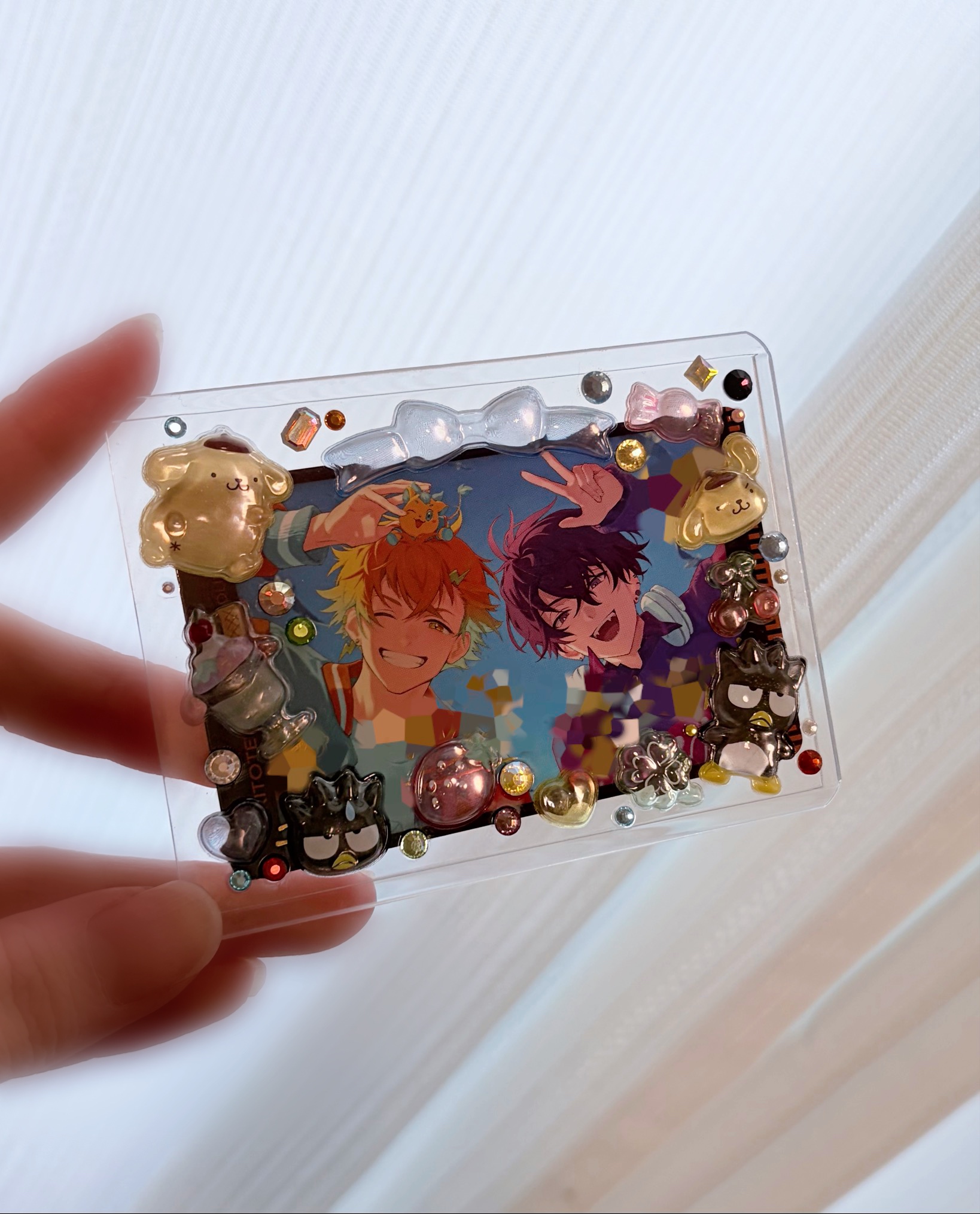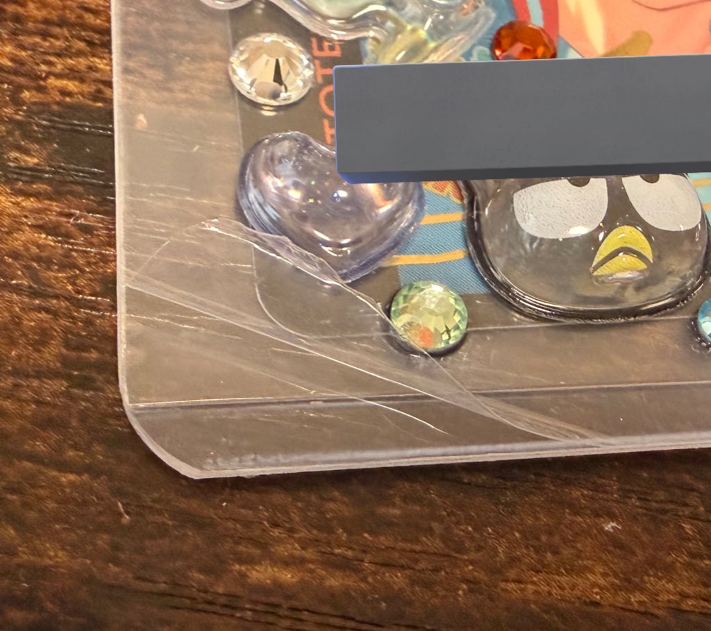 恐怖画像最初にデコったとき接着剤とラインストーンがうまくくっつかないな…カードケースもクリアタイプ買った割に曇ってるし…と思ってたら薄皮剥いてなくて貴重なボンボンドロップシールを無駄にした……😭と思ったけどどうにかリカバリーできた(1枚目)