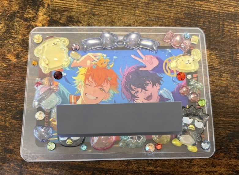 最初にデコったとき接着剤とラインストーンがうまくくっつかないな…カードケースもクリアタイプ買った割に曇ってるし…と思ってたら薄皮剥いてなくて貴重なボンボンドロップシールを無駄にした……😭と思ったけどどうにかリカバリーできた(1枚目)