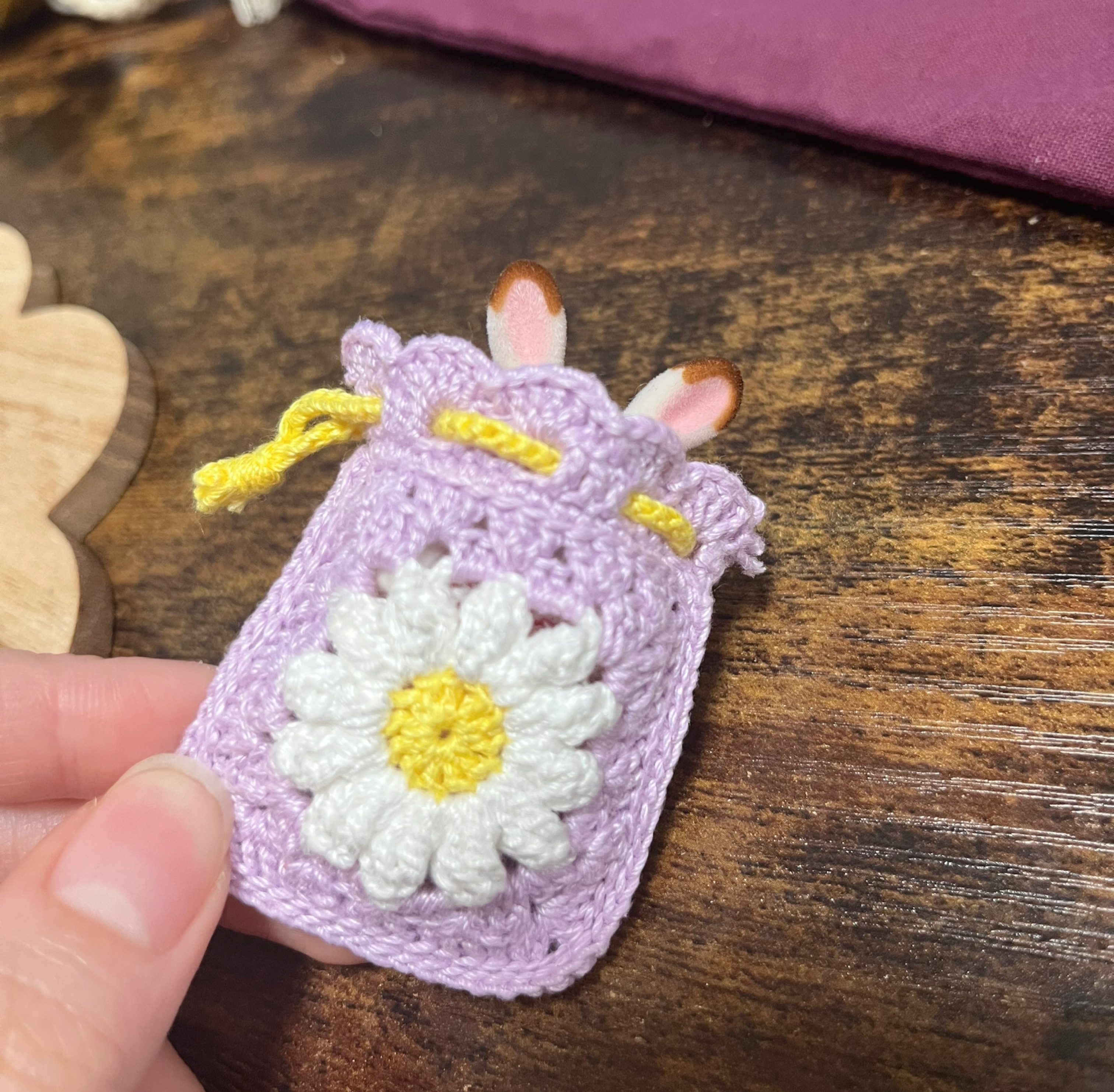 相変わらず編み物している これはショコラうさぎの赤ちゃんの耳が入らない大きさの巾着袋
