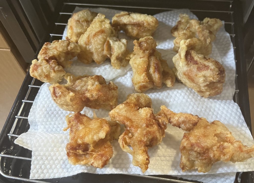 いつも自分で唐揚げ揚げる時は油もケチるし洗い物もしたくないから肉入った袋に粉ぶちまけて唐揚げ風って感じの仕上がりになっていたけど、今回は流石にちゃんと贅沢に油用意して衣もちゃんと作った その結果パーフェクト唐揚げの見た目になったのではないでしょうか……