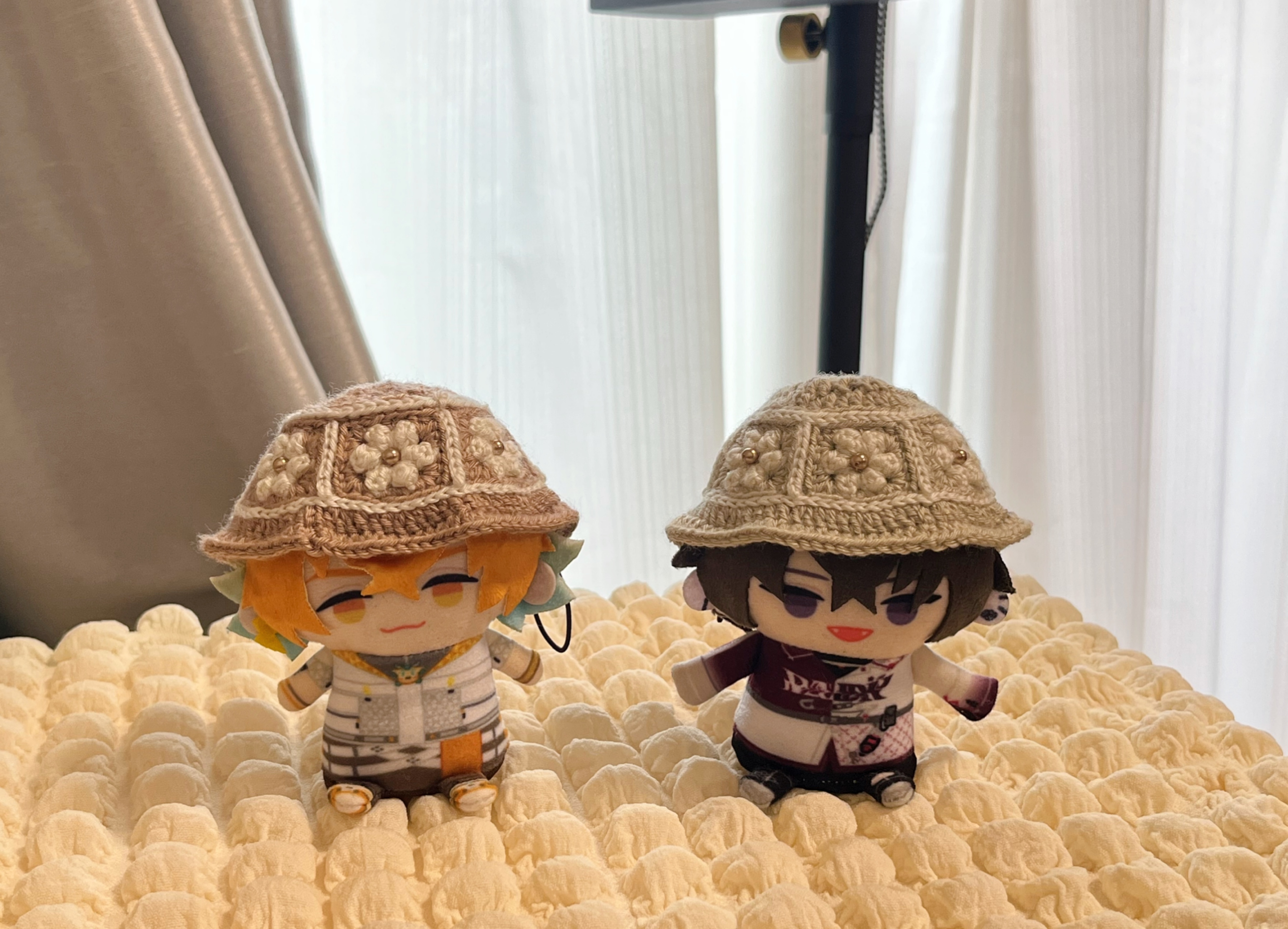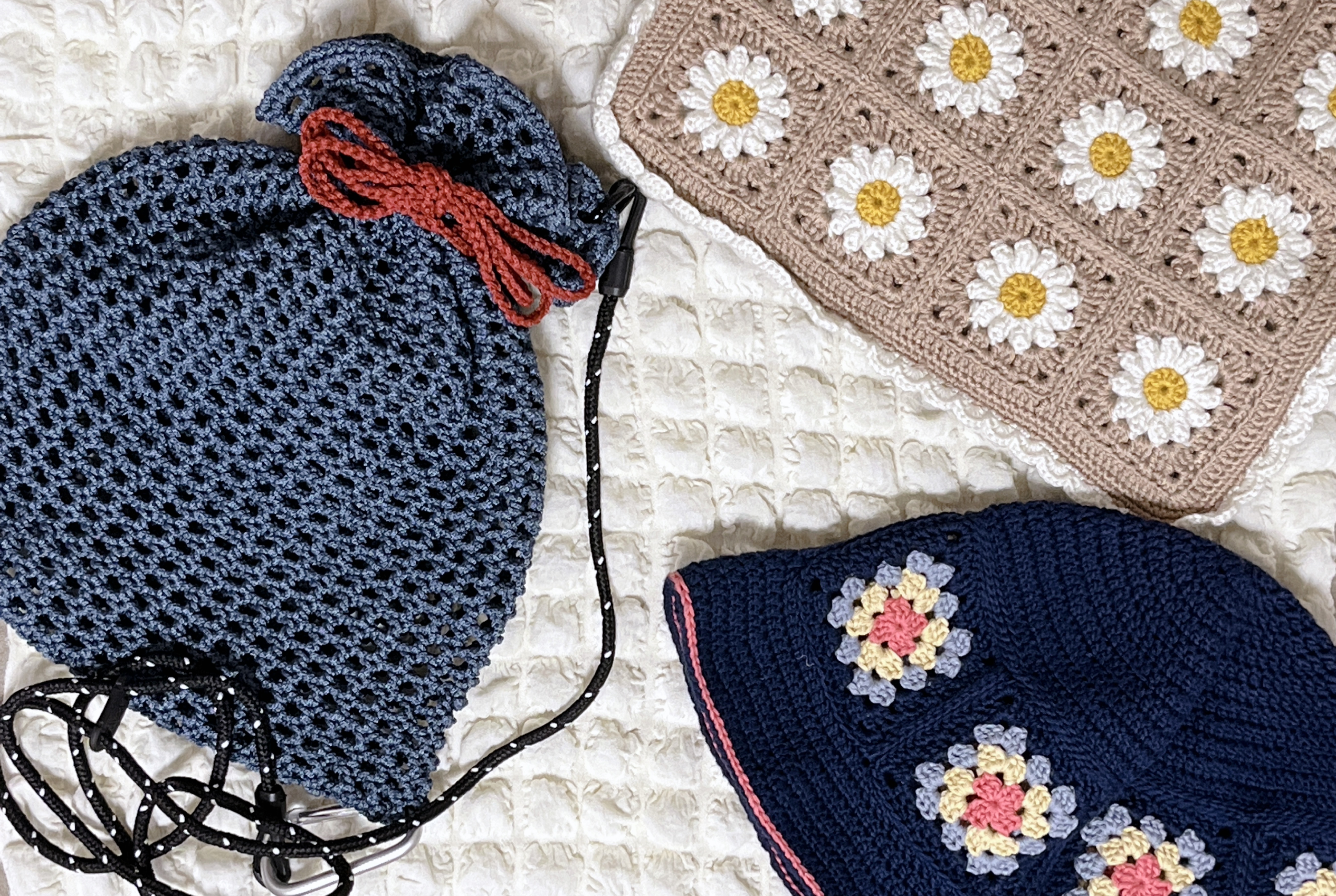 これまで編んだものを写真に撮るときベッドのシワシワのシーツを背景にするしかなかったので100均で小さい布を買った 編んだもの並べると可愛いな 帽子もかなり被ってる