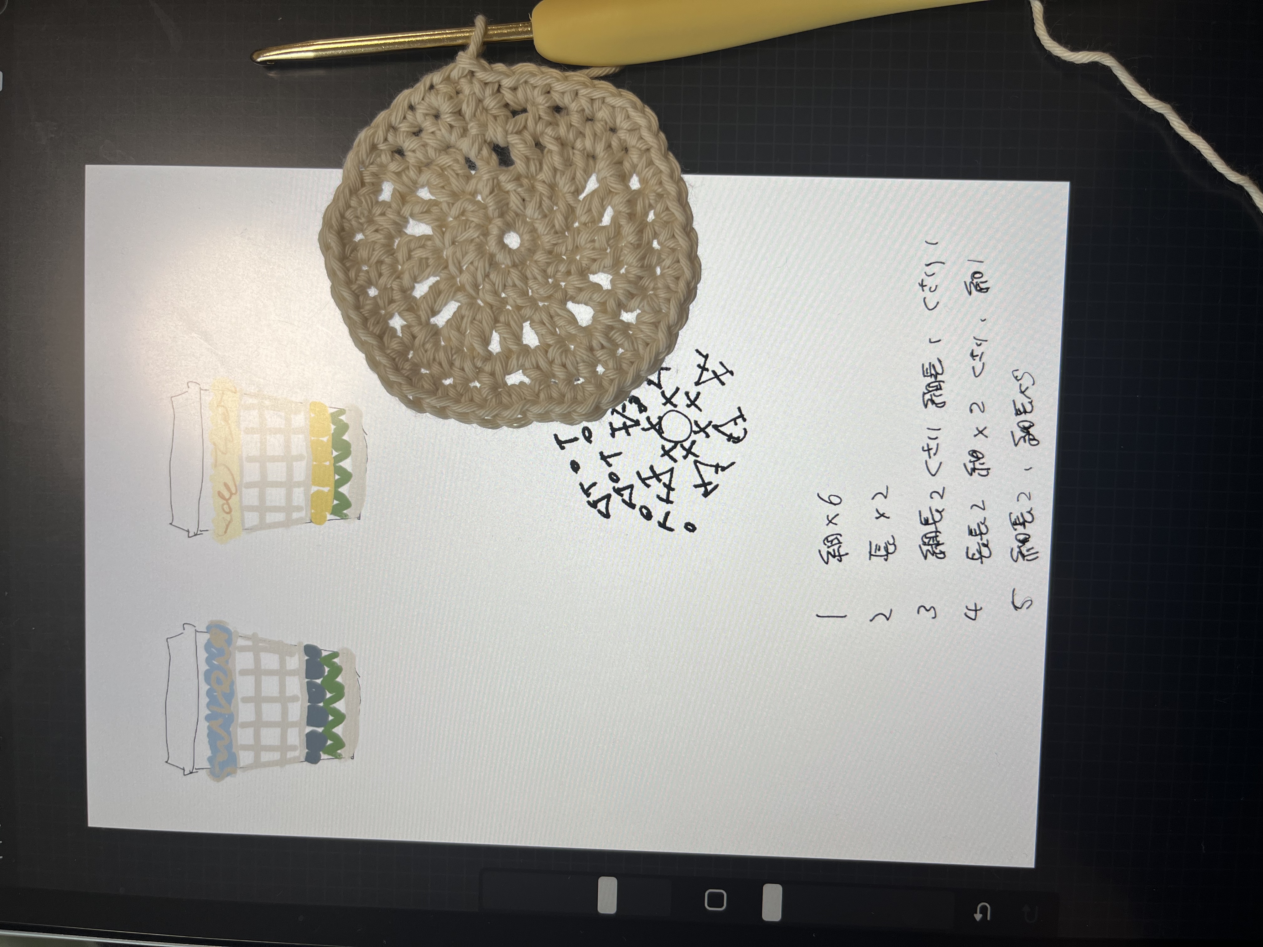 手持ちの糸で作りたいイメージラフ描いてから編み始めるのを初めてやったので手探りでメモしまくった 改善点はあれど概ねイメージ通りのものができたのではないでしょうか……